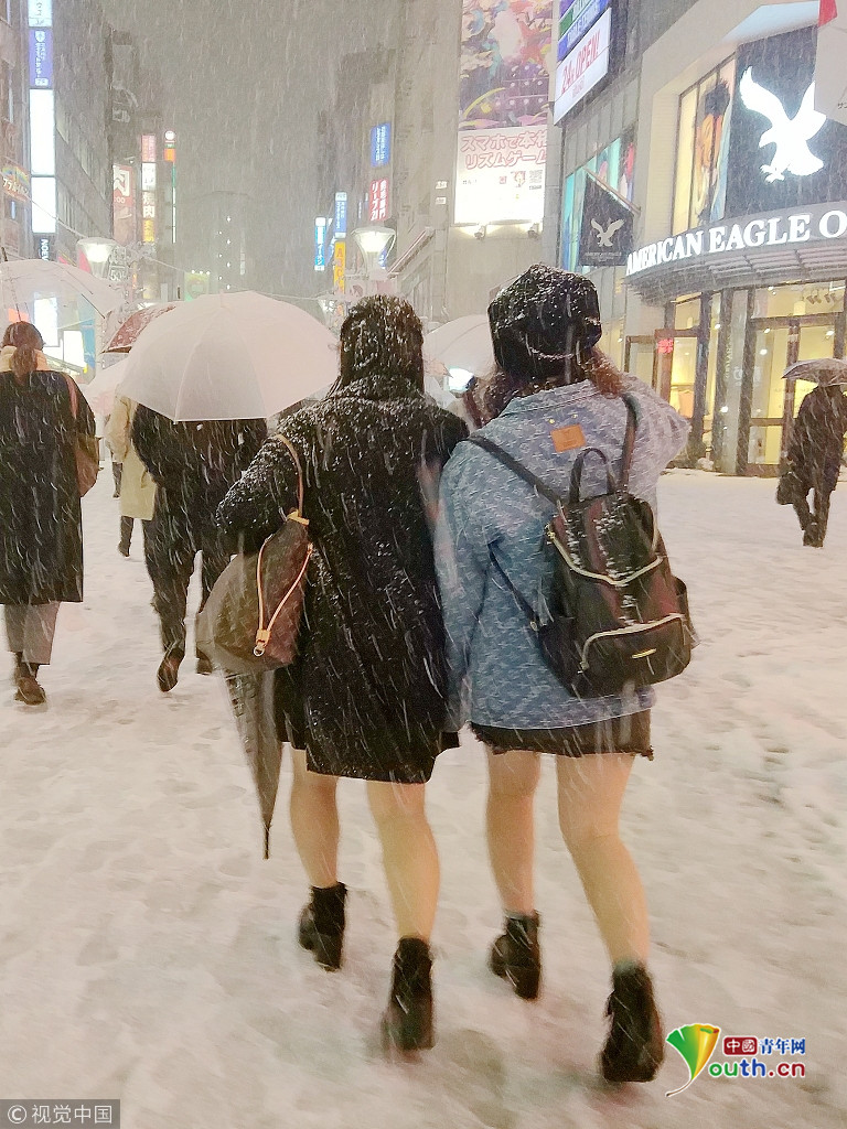 日本东京大雪交通混乱 高中女生光腿短裙雪中行
