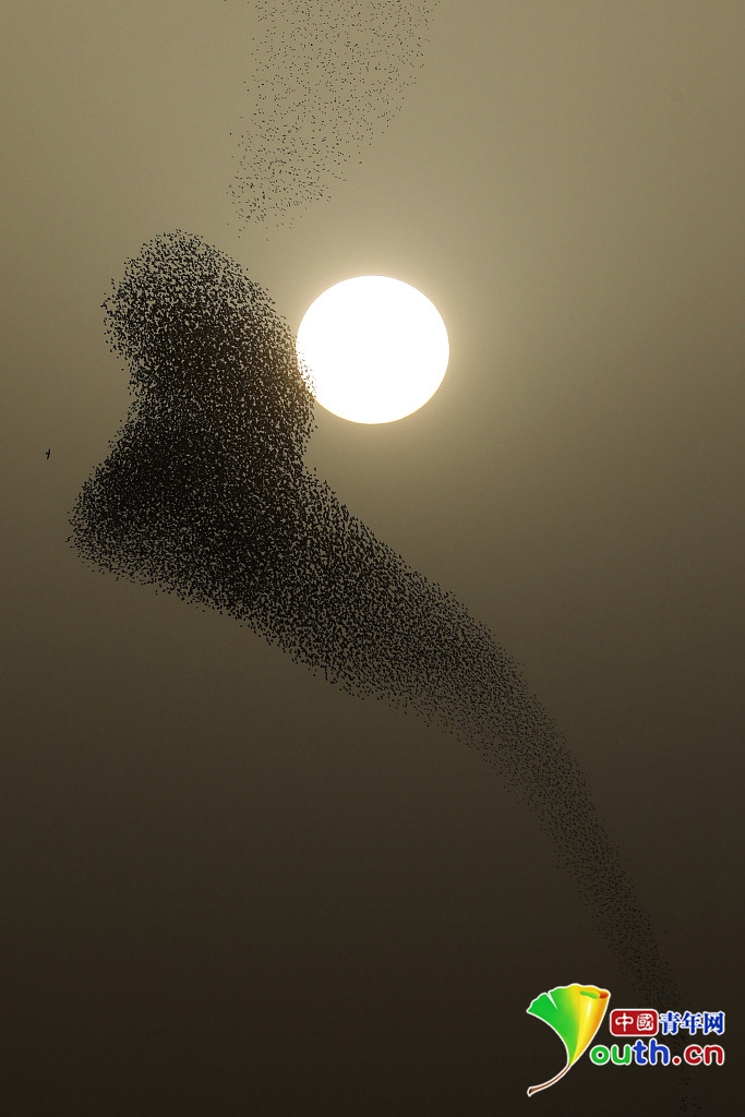 当地时间2018年1月22日,以色列拉哈特,聚集的椋鸟群在天空飞舞,场面壮观。图片作者:MENAHEM KAHANA /视觉中国