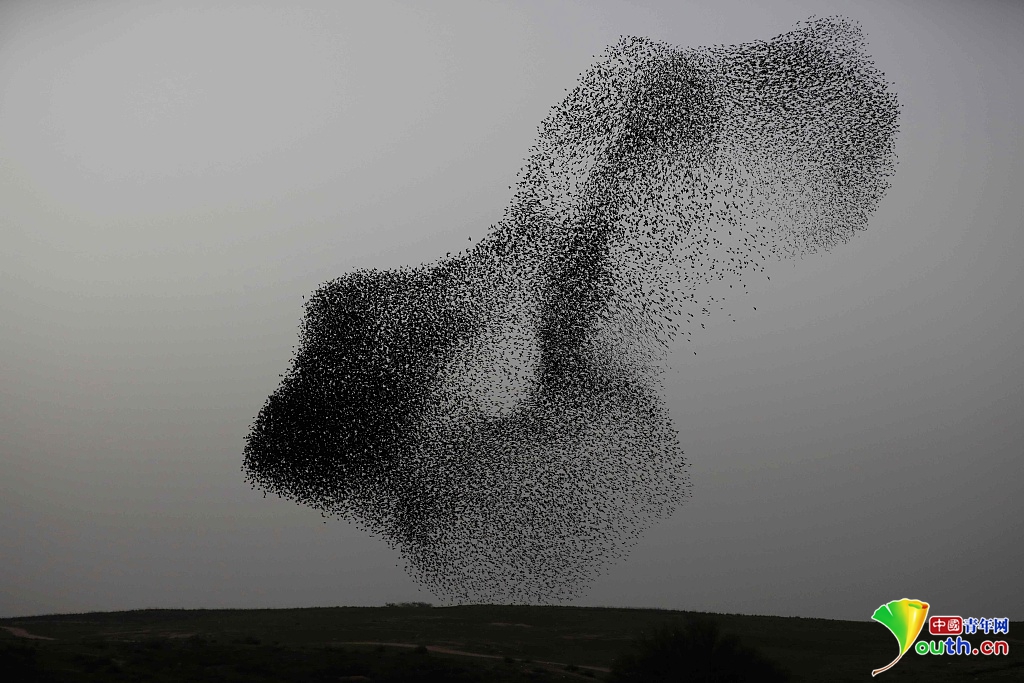 当地时间2018年1月22日,以色列拉哈特,聚集的椋鸟群在天空飞舞,场面壮观。图片作者:MENAHEM KAHANA /视觉中国