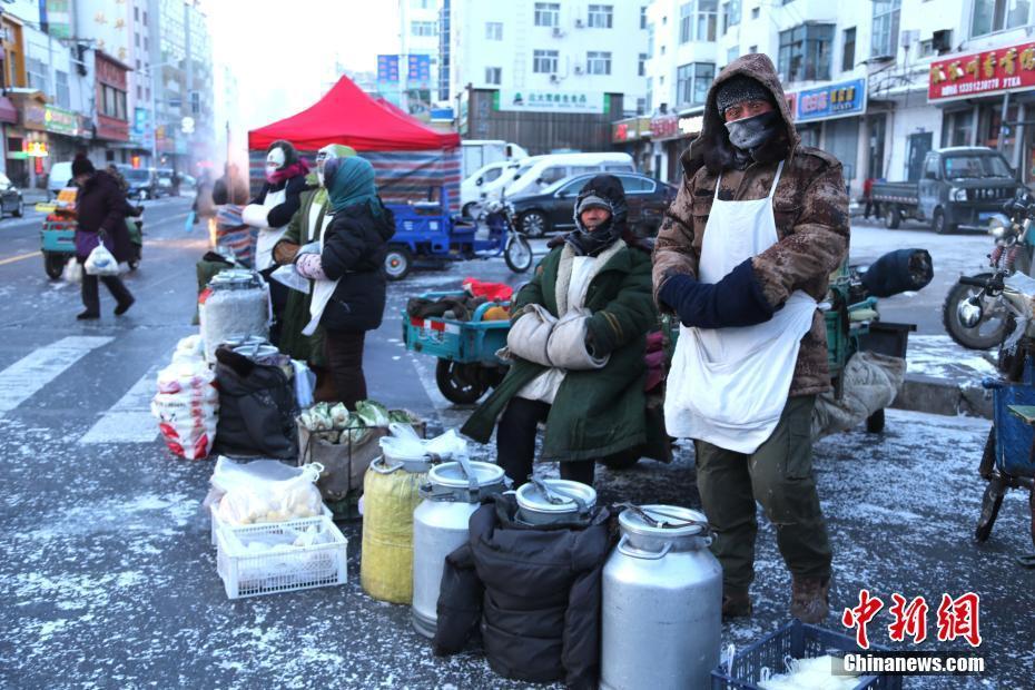 ​1月23日,黑龙江黑河出现持续降温达到近零下40度严寒天气,黑河早市街头市场商贩明显减少,商贩们裹着厚厚的棉装,脸上挂着寒霜。 中新社发 张辉 摄