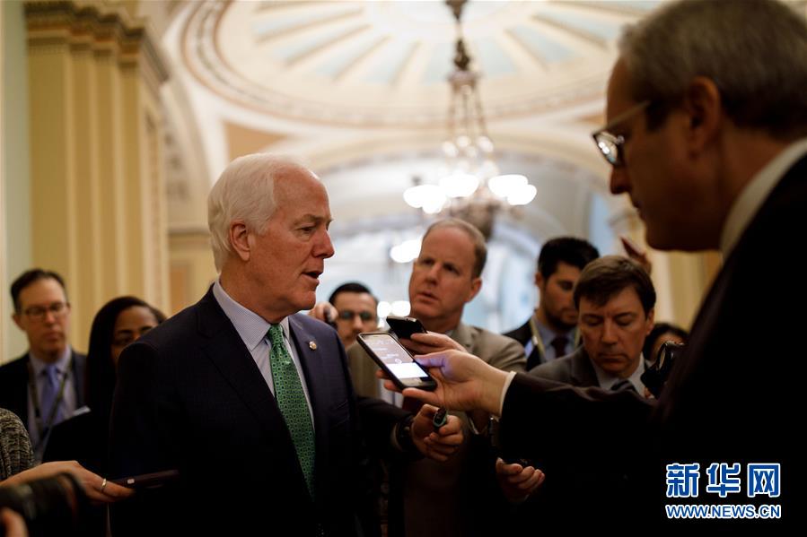 1月22日,在美国华盛顿国会山,共和党参议员约翰·科宁(前左)接受记者采访。美国国会22日通过一项临时拨款法案,维持联邦政府运转至2月8日,结束了持续三天的美国政府“关门”风波。 新华社发(沈霆摄)