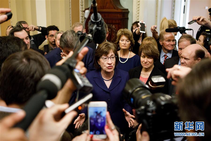 1月22日,在美国华盛顿国会山,参议员苏珊·柯林斯(中)被记者包围。美国国会22日通过一项临时拨款法案,维持联邦政府运转至2月8日,结束了持续三天的美国政府“关门”风波。 新华社发(沈霆摄)