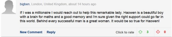 英国伦敦的网友bigben表示:“如果我能再有钱一些的话,我一定会帮助这位伟大的女士的。蒋昊文是个非常聪明的孩子,擅长数学,过目不忘。他如果能够有更多的帮助,必定能在世上有所作为。常言说,‘每个成功的男人背后都有个伟大的女人’,昊文背后伟大的女人就是他的奶奶。”