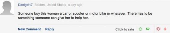 美国波士顿的网友danigiri17写道:“谁来给她买辆车,或者至少买个小摩托车之类的。肯定有人能够帮助她。”