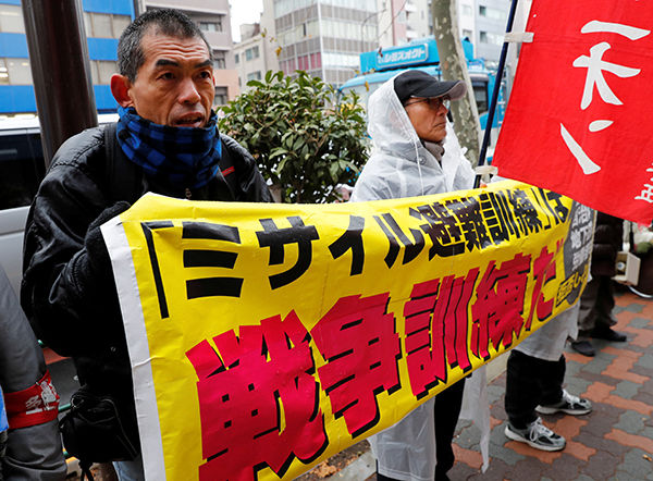 日本东京巨蛋城游乐园外,抗议者举着“导弹避难训练是战争训练”的标语。