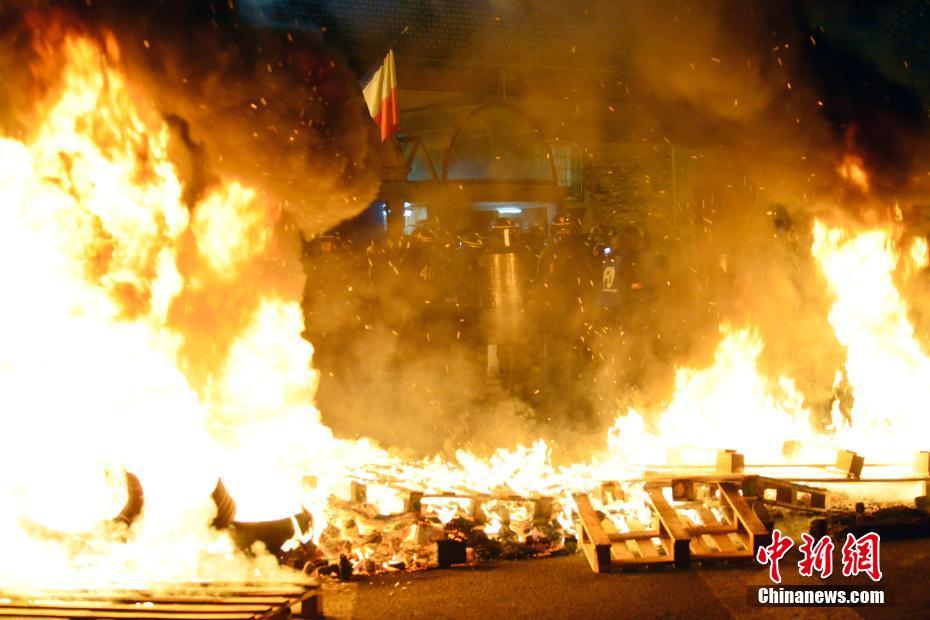 图为23日清晨,抗议狱警在全法第二大监狱——费雷讷看守所门前发起封堵行动。 中新社记者 龙剑武 摄
