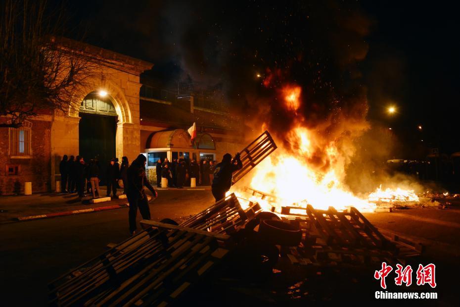 图为23日清晨,抗议狱警在全法第二大监狱——费雷讷看守所门前发起封堵行动。 中新社记者 龙剑武 摄
