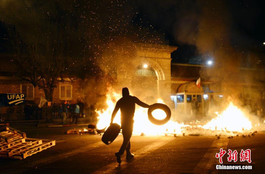 图为23日清晨,抗议狱警在全法第二大监狱——费雷讷看守所门前发起封堵行动。 中新社记者 龙剑武 摄
