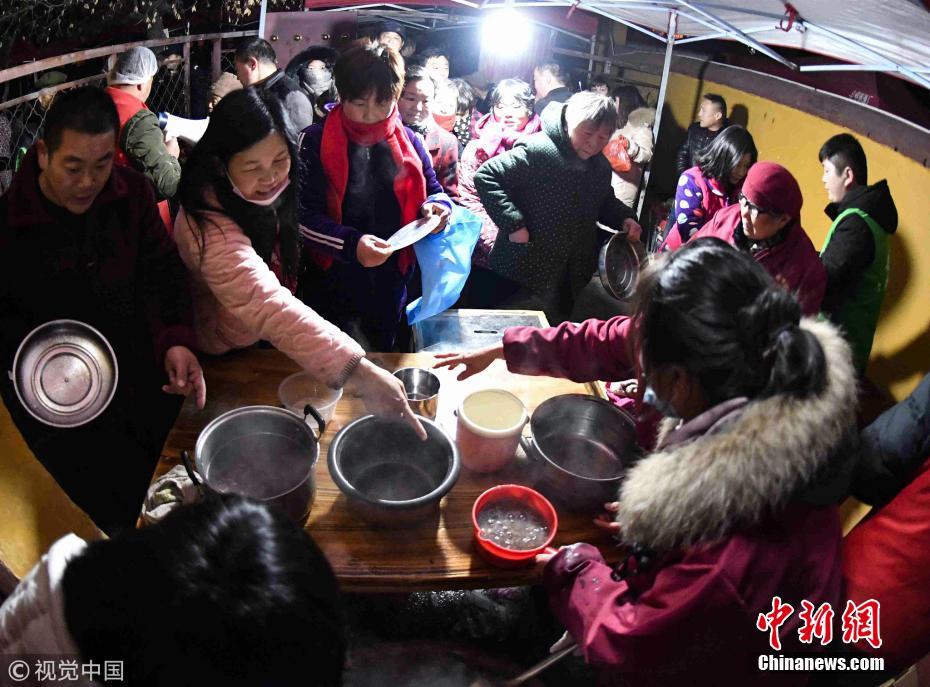 2018年1月24日凌晨,在安徽省亳州市白依律院放粥点,市民在排队领取免费的“腊八粥”,祈求来年风调雨顺,五谷丰登。图片来源:视觉中国