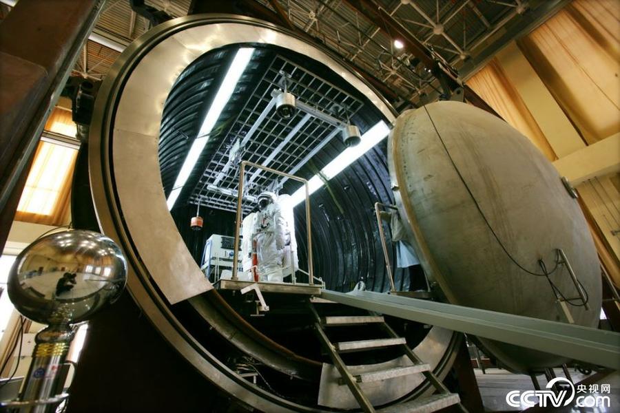 2008年4月18日,航天员在低压舱进行航天服低压试验。摄影:朱九通