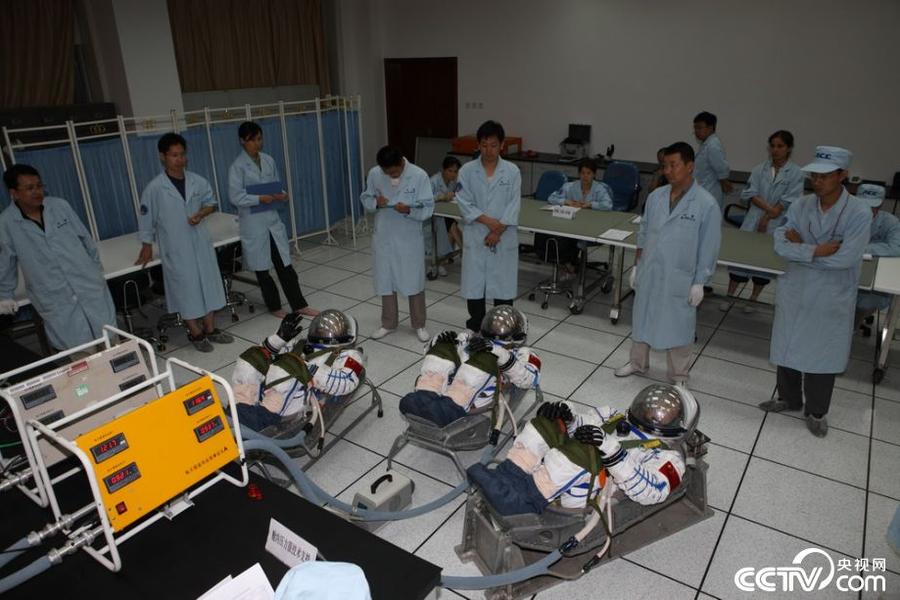 2008年8月4日,航天员在航天服车间进行航天服匹配试验。摄影:朱九通