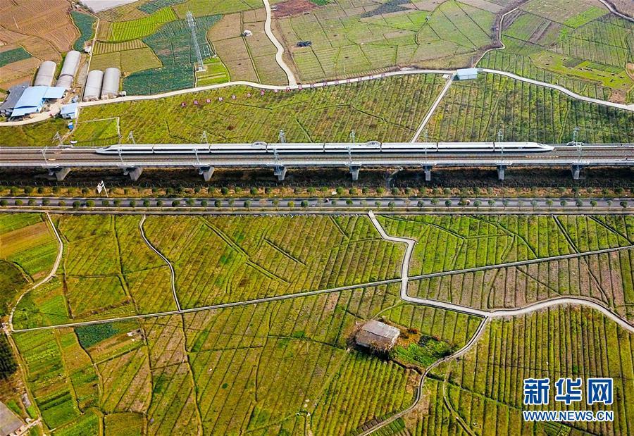 1月12日,一列渝贵铁路测试运行动车从贵州省遵义市娄山关镇的农田经过。新华社记者 刘潺摄
