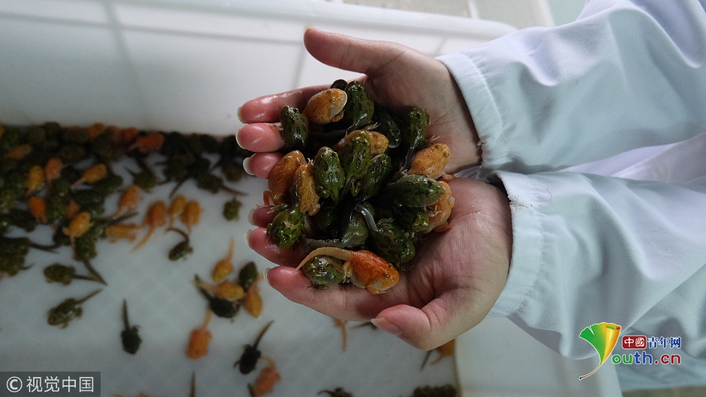 2017年12月6日,重庆。我们身边从来不缺把宠物当宝贝的人,可是为了宠物能放弃稳定收入甚至转行的,恐怕没有几个。李舒就是这样一个特立独行的重庆崽儿,因为喜欢爬虫,原本学戏曲表演的他跨行研究起了角蛙繁殖,为了全身心投入研究事业,他还卖掉了经营七年的街舞俱乐部。丰厚的收入没有了,大老板不当了,稳定的生活不要了……朋友们都说:他疯了。2017年12月6日,重庆。 角蛙的繁殖问题,一直是爬虫界想要攻克的一个难题,国内繁殖技术的不过关,导致宠物蛙类爱好者基本买不到国内自己繁殖的蛙类,想养角蛙只有通过国外进口而来。拥有钻研劲儿的李舒心想,如果可以让角蛙人工繁殖成功,那是多酷的一件事啊。于是,李舒开始了从热爱走上了研究的路,他一点一点摸索角蛙的生活习性,和圈内发烧友交流,浏览各种爬虫书籍,收集各种角蛙做研究……李舒觉得时间完全不够用了。为了更好地投入到研究中,李舒卖掉了经营7年的街舞俱乐部。有人觉得他就是“有病”,女朋友也因此和他分了手。供图:视觉中国