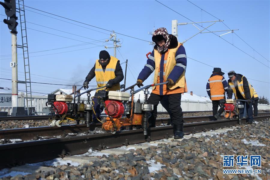 1月23日,在黑龙江尚志市亚布力镇滨绥铁路沿线,哈尔滨铁路局牡丹江工务段工作人员养护铁路。新华社发(张春祥 摄)