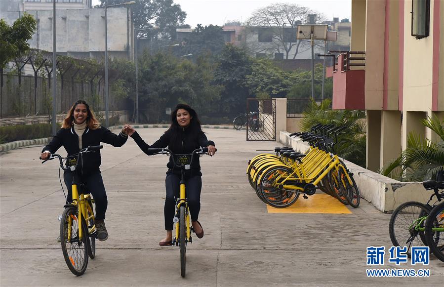 1月23日,在印度首都新德里一所女子学校,两名女生骑着ofo“小黄车”穿行在校园中。据共享单车平台ofo印度有关负责人介绍,截至1月15日,ofo“小黄车”已进入新德里、印多尔、班加罗尔、艾哈迈达巴德、浦那、哥印拜陀、金奈7个城市开展试点项目,预计将于1月底在印度全国投放3000辆共享单车。新华社记者张迺杰摄