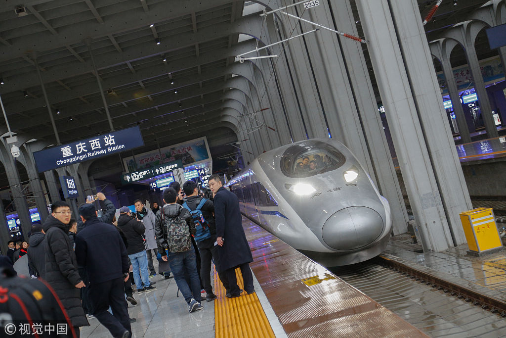 2018年1月25日,重庆,贯通整个西南、西北地区的渝贵铁路正式开通运营。上午8:50分,由重庆西站驶往贵阳北站的G8581次列车缓缓驶出站台,这也是由重庆西站发出的首趟重庆至贵阳高铁列车,预计将于11:03分抵达贵阳北站,全程运行时间2小时13分。供图:大渝网 耿骏宇/视觉中国 文字来源:央广网