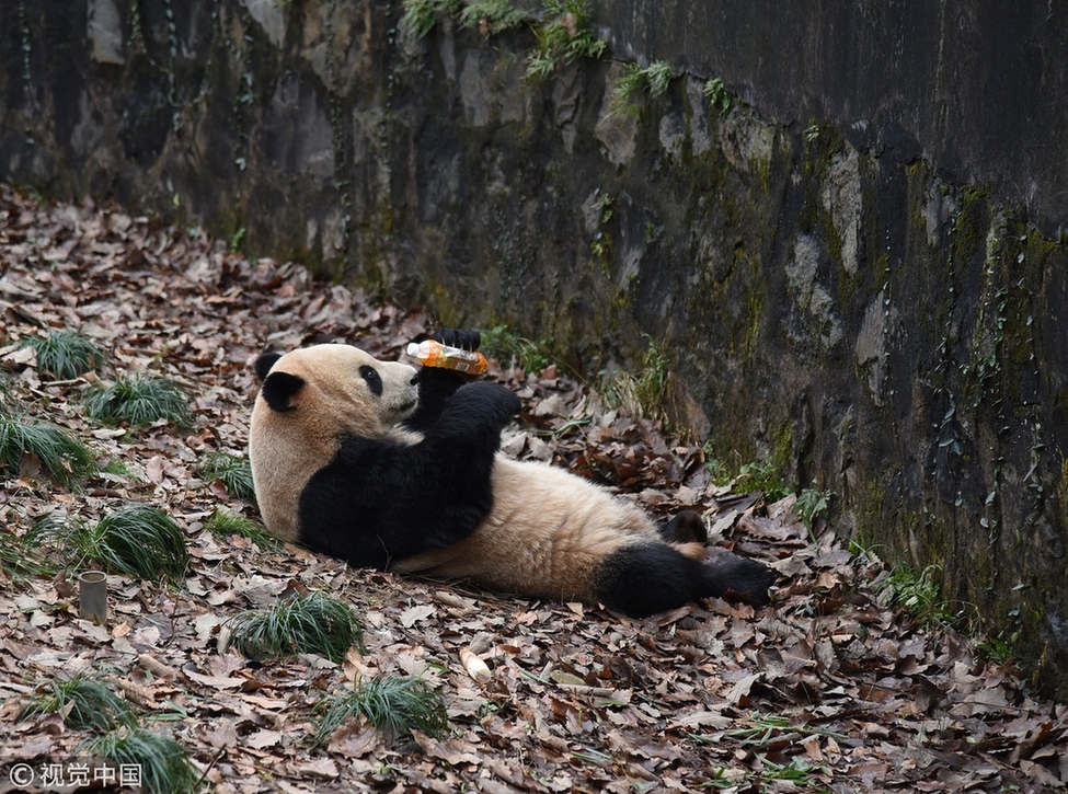 2018年1月22日,杭州动物园熊猫馆露天活动场边上,一位游客不慎把随身带着的满瓶饮料掉下去了,一只熊猫捧起饮料瓶用牙狂啃撕咬。工作人员用打捞的竹竿干扰大熊猫的撕咬,经过三次打捞才把饮料瓶打捞上来。