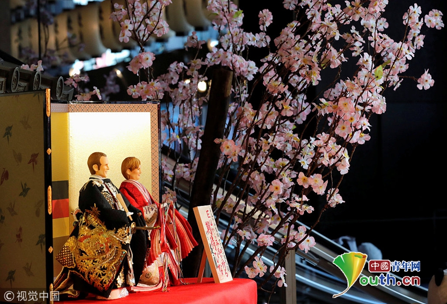 当地时间2018年1月25日,日本东京,由纯手工打造的法国总统马克龙以及德国总理默克尔形象的希娜娃娃在当地亮相。