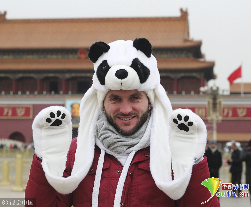 2018年1月21日,北京,游客裹得严严实实游览天安门广场游兴不减。当天北京阴沉密布,气温快速下滑,最高气温骤降至零度。