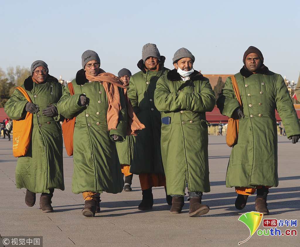 2017年12月3日,游客裹得严严实实游览天安门广场。当天,北京刮起3、4级偏北风,阵风达到6级,由于风寒效应人体感觉十分寒冷。
