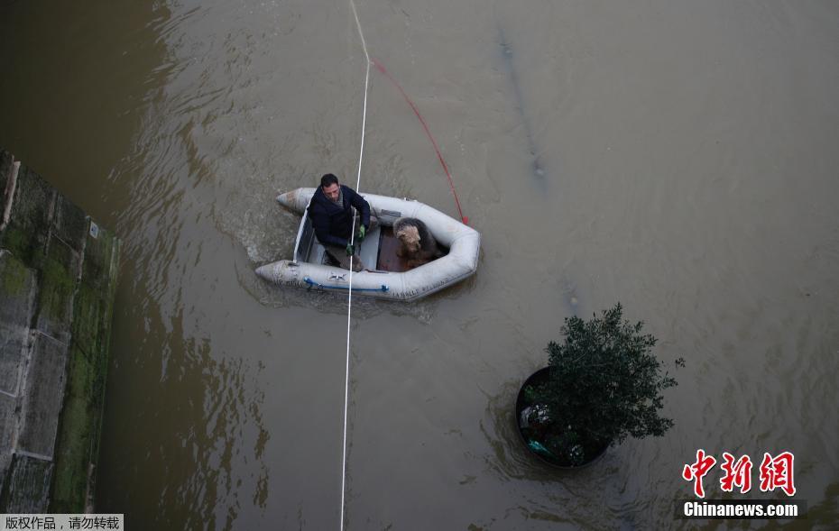 法国塞纳河上升淹没街道 民众乘舟出行