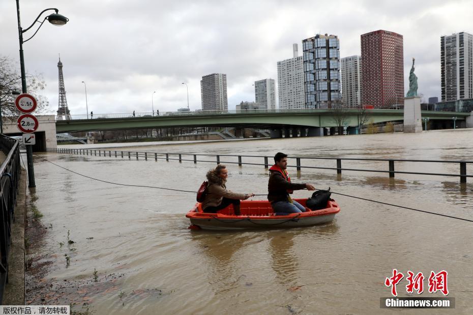法国塞纳河上升淹没街道 民众乘舟出行