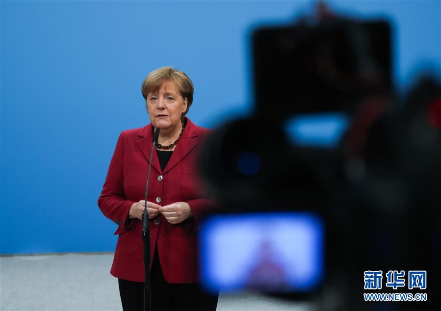 1月26日,在德国首都柏林的基民盟总部,德国总理、基民盟主席默克尔在谈判开始前发表讲话。当日,德国联盟党(由基民盟和基社盟组成)和社民党开始进行正式组阁谈判。新华社记者 单宇琦 摄