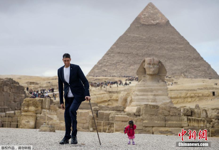 当地时间2018年1月26日,埃及吉萨,“世界第一高人”苏丹-克森与世界最袖珍女孩乔蒂-阿姆奇受埃及旅游促进委员会的邀请,参观埃及金字塔,为促进埃及旅游打广告。34岁的苏丹-克森来自土耳其马尔丁,在2009年以2.465米的身高成为“世界第一高人”,并刷新吉尼斯世界纪录。24岁的乔蒂-阿姆奇来自印度纳格普尔,身高有62.8厘米左右,体重6公斤左右,2013年被吉尼斯认定为世界最矮女性。