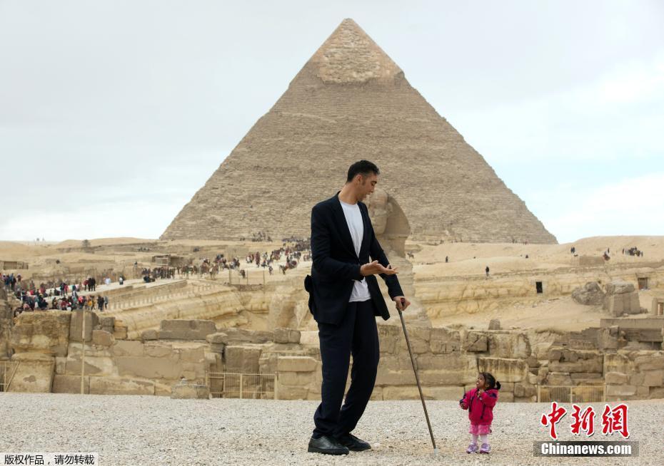 当地时间2018年1月26日,埃及吉萨,“世界第一高人”苏丹-克森与世界最袖珍女孩乔蒂-阿姆奇受埃及旅游促进委员会的邀请,参观埃及金字塔,为促进埃及旅游打广告。34岁的苏丹-克森来自土耳其马尔丁,在2009年以2.465米的身高成为“世界第一高人”,并刷新吉尼斯世界纪录。24岁的乔蒂-阿姆奇来自印度纳格普尔,身高有62.8厘米左右,体重6公斤左右,2013年被吉尼斯认定为世界最矮女性。
