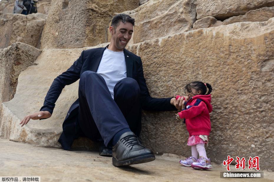 当地时间2018年1月26日,埃及吉萨,“世界第一高人”苏丹-克森与世界最袖珍女孩乔蒂-阿姆奇受埃及旅游促进委员会的邀请,参观埃及金字塔,为促进埃及旅游打广告。34岁的苏丹-克森来自土耳其马尔丁,在2009年以2.465米的身高成为“世界第一高人”,并刷新吉尼斯世界纪录。24岁的乔蒂-阿姆奇来自印度纳格普尔,身高有62.8厘米左右,体重6公斤左右,2013年被吉尼斯认定为世界最矮女性。