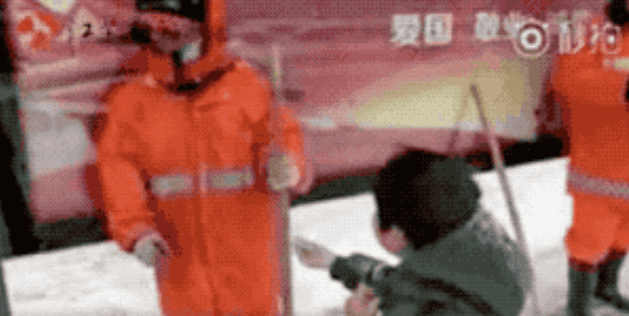 △孩子看到环卫工人扫雪时,从兜里拿出大白兔奶糖,送给环卫工人们