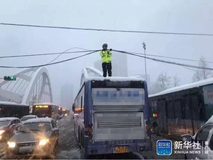 协警熊陈爬上公交车顶