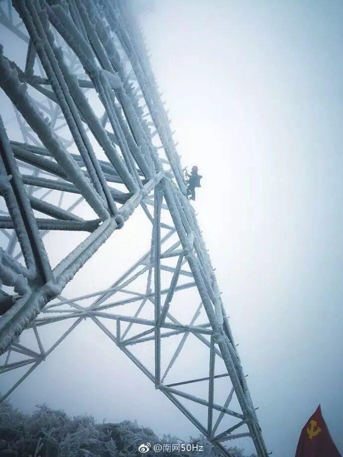 △保障输电设备安全运营,检修员冒着大雪爬上铁塔,边敲冰,边安装融冰短接线