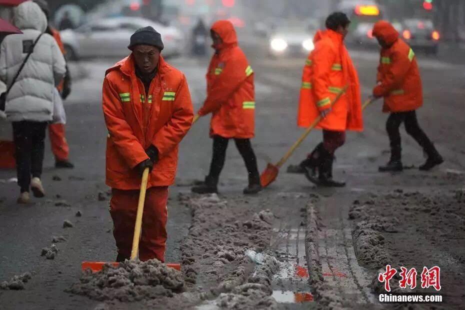 △漫天飞雪,环卫工人一大早就开始忙活