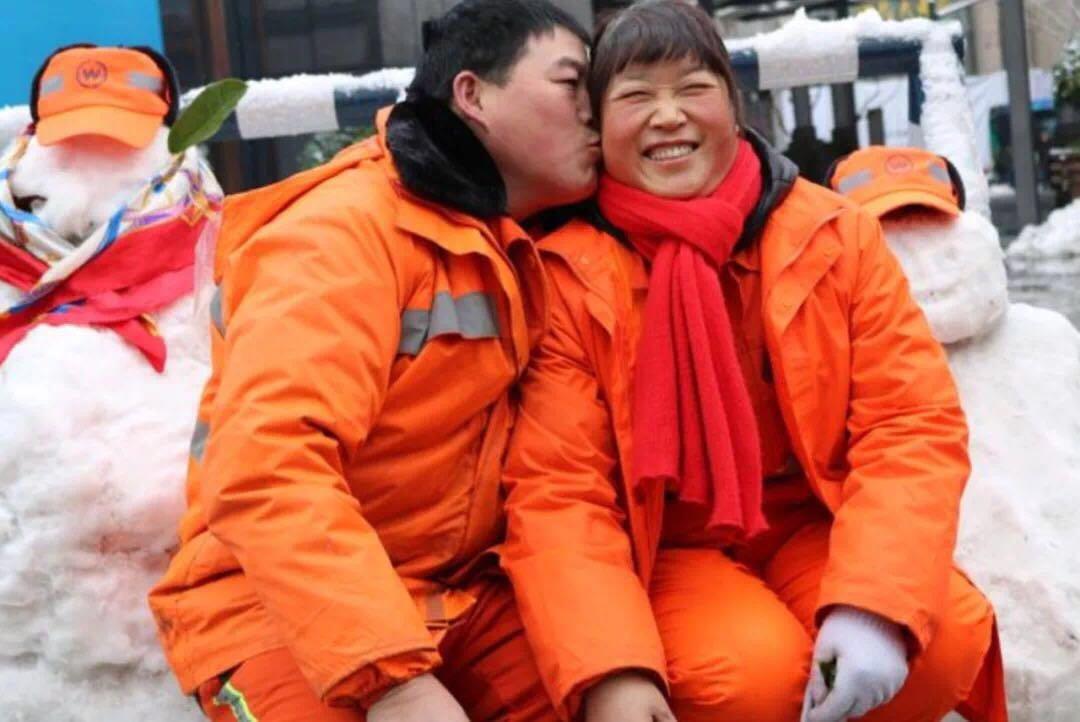 △夫妻二人都是环卫工人,为了扫雪已经连续两天没回过家。虽然在同一条路上扫雪,却因为工作量大一天都难得说上几句话。午饭时间,看到路边堆着雪人,男子立刻拉着妻子冲到雪人面前,请同事帮他俩拍一张合影,还偷偷给了妻子一个吻。(图/浙江新闻客户端)