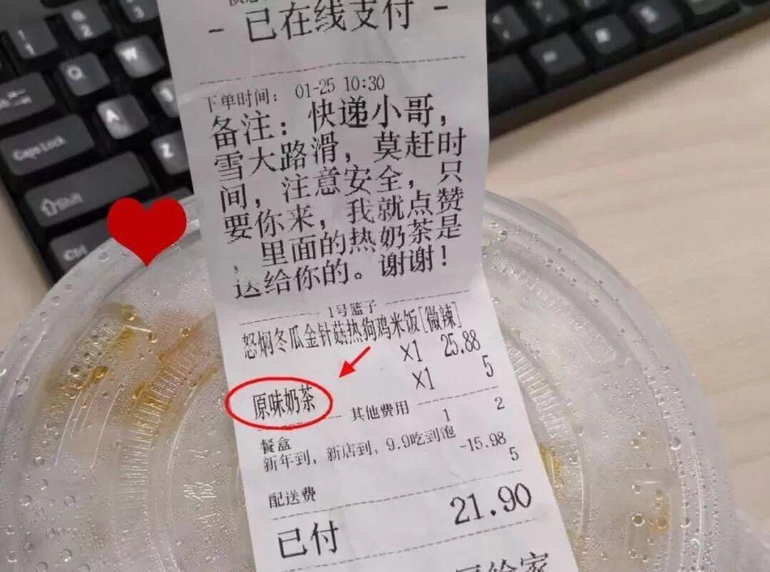 △“雪大路滑,莫赶时间,注意安全”,送给外卖小哥的这杯奶茶,温暖了寒冬。