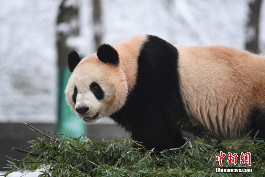 1月27日,一只熊猫正在进食。近日,浙江杭州迎来多年不遇的大雪,杭州动物园两只熊猫不惧寒冷,在雪地里活动、进食,憨萌可掬。 中新社记者 王刚 摄