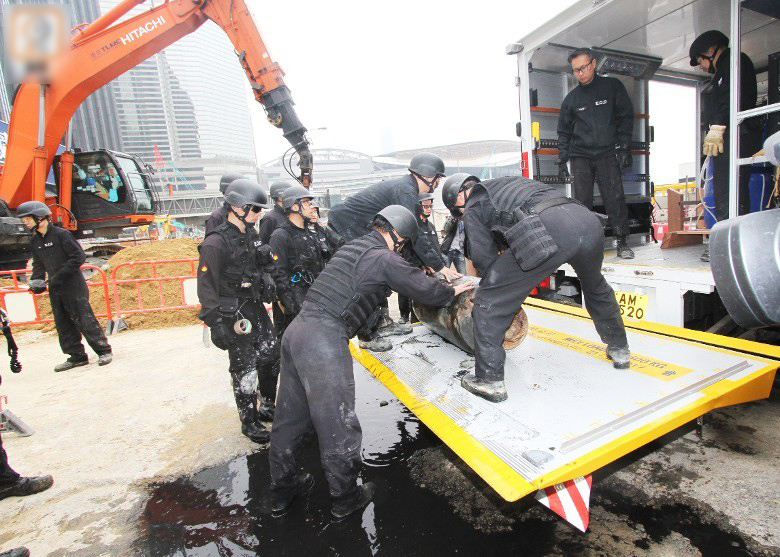 拆弹成功后,工作人员与炸弹合照