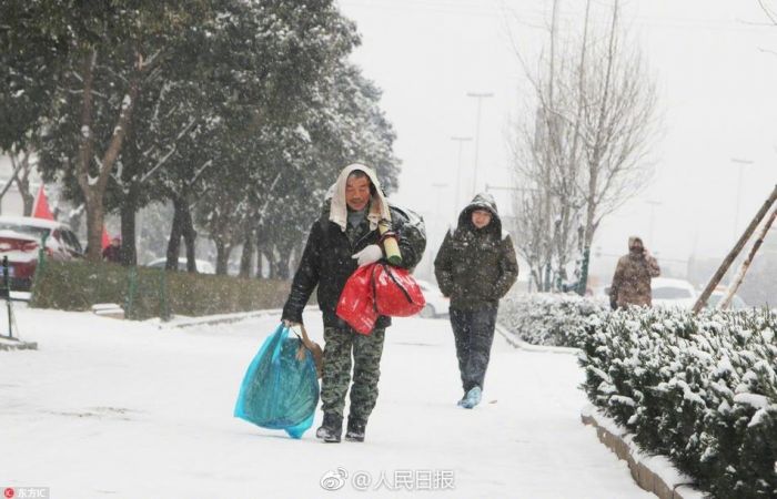 25日,河南洛阳暴雪,汽车站发往各县的公交停运。60岁赵大爷舍不得打车,于是背着凉席、电扇和棉被等徒步回80里外的老家。他说挣钱不容易,一个月2000多工资,工钱还只给一半。省些路费,过年给老伴买件新衣服。