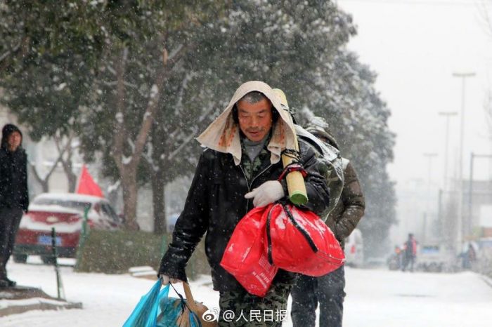 25日,河南洛阳暴雪,汽车站发往各县的公交停运。60岁赵大爷舍不得打车,于是背着凉席、电扇和棉被等徒步回80里外的老家。他说挣钱不容易,一个月2000多工资,工钱还只给一半。省些路费,过年给老伴买件新衣服。