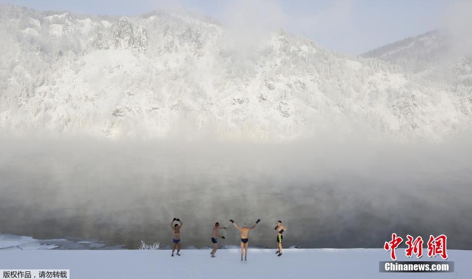 冬泳爱好者在叶尼塞河旁进行训练前的热身活动。