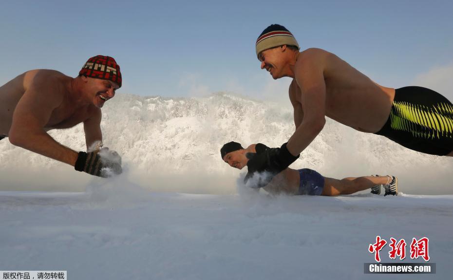 当地时间2018年1月26日,俄罗斯季夫诺戈尔斯克,冬泳爱好者在叶尼塞河旁进行训练前的热身活动。当时户外气温达到-31℃。来源:中国新闻网