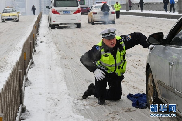 1月27日,在湖北省武汉市江汉一桥桥面,民警将衣服铺垫在雪地上协助推车。新华社发(金思柳 摄)