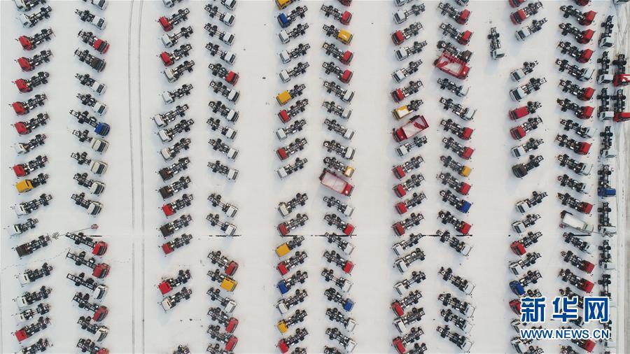 1月28日,在湖北省襄阳市,汽车企业生产的新车在雪地上排列整齐,独具美感。新华社发(王虎 摄)