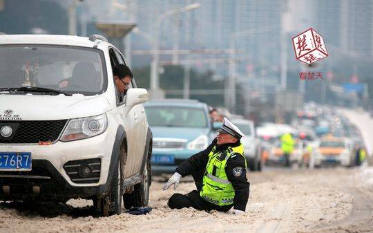 1月26日开始的一场大雪,使武汉江汉一桥桥面上布满了冰雪。这里坡陡、雪厚、路滑,车辆通过时不但爬坡很难,还容易导致无法控制的后溜,此时撒盐已经起不到作用。武汉硚口区交通大队一中队副中队长曹勇和15名同事一起,当天早上7点开始守在这里,配合城管融雪除冰,一辆又一辆地推出被困车辆。