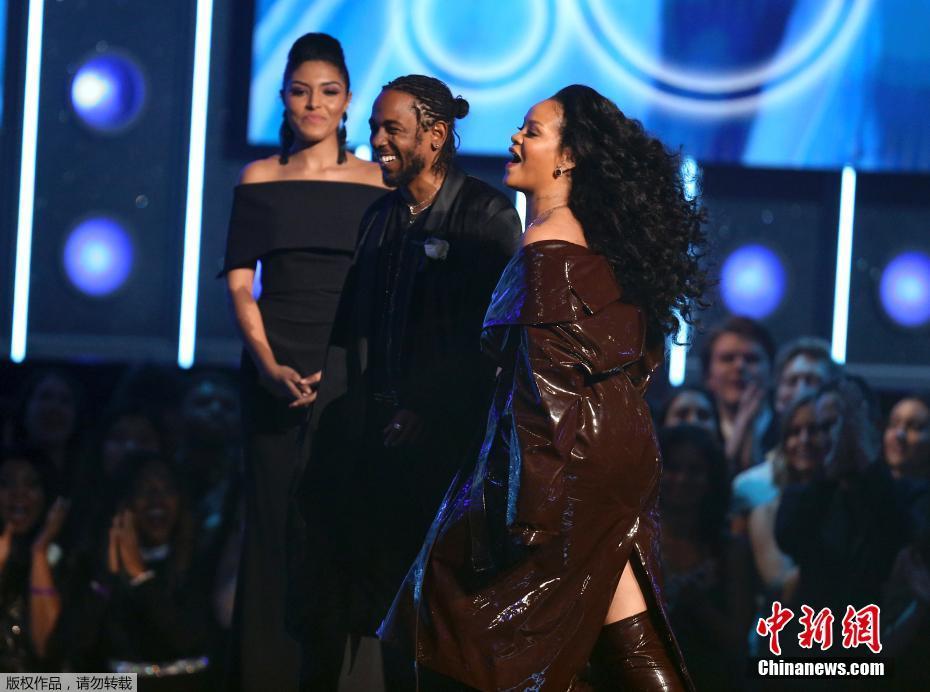 Kendrick Lamar(中)及Rihanna(右)凭借歌曲《LOYALTY》联手拿下最佳饶舌/演唱表演奖。