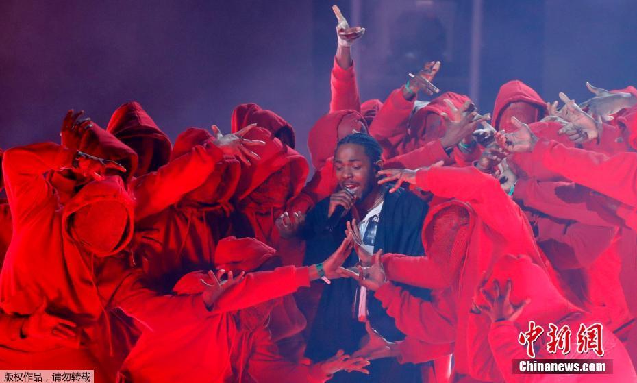 当地时间2018年1月28日晚,第60届格莱美颁奖典礼在美国纽约举行。作为一年中最受关注的音乐盛宴,本届格莱美可谓星光闪耀。图为Kendrick Lamar进行现场表演,他目前已经凭借去年最红的单曲“HUMBLE.”拿下最佳说唱歌手、最佳说唱歌曲大奖。