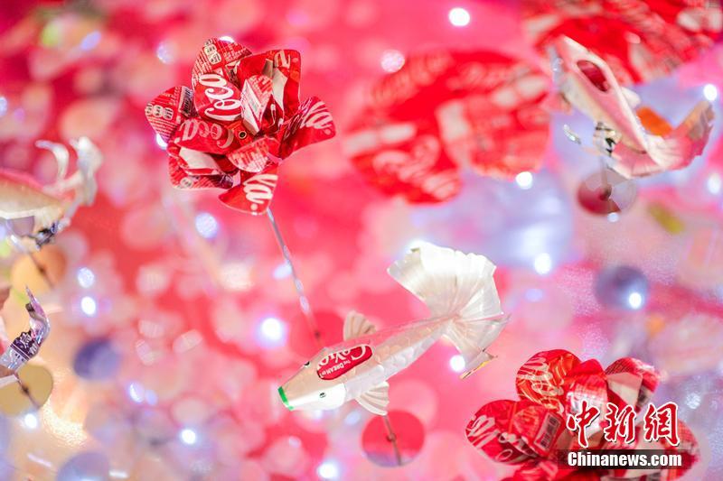 5米易拉罐双鱼装置亮相 由2500个易拉罐打造