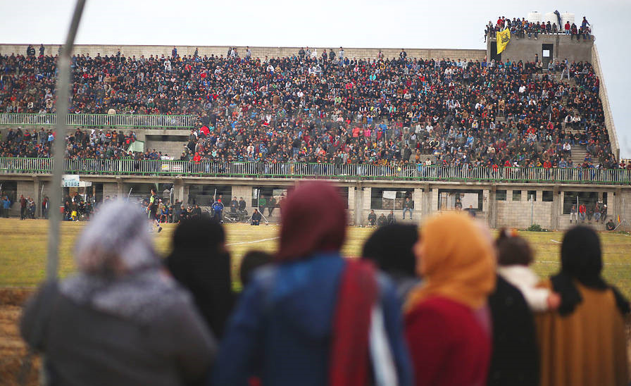 当地时间2018年1月28日,加沙加沙城,在哈马斯统治地区的Nuseirat难民营,巴勒斯坦妇女们围在体育场栅栏后观看一场正在进行的足球赛。当局不允许她们进入体育场内部观看比赛。据新华国际早前报道称,在传统巴勒斯坦社会中,男性仍然占据主导地位。图:视觉中国