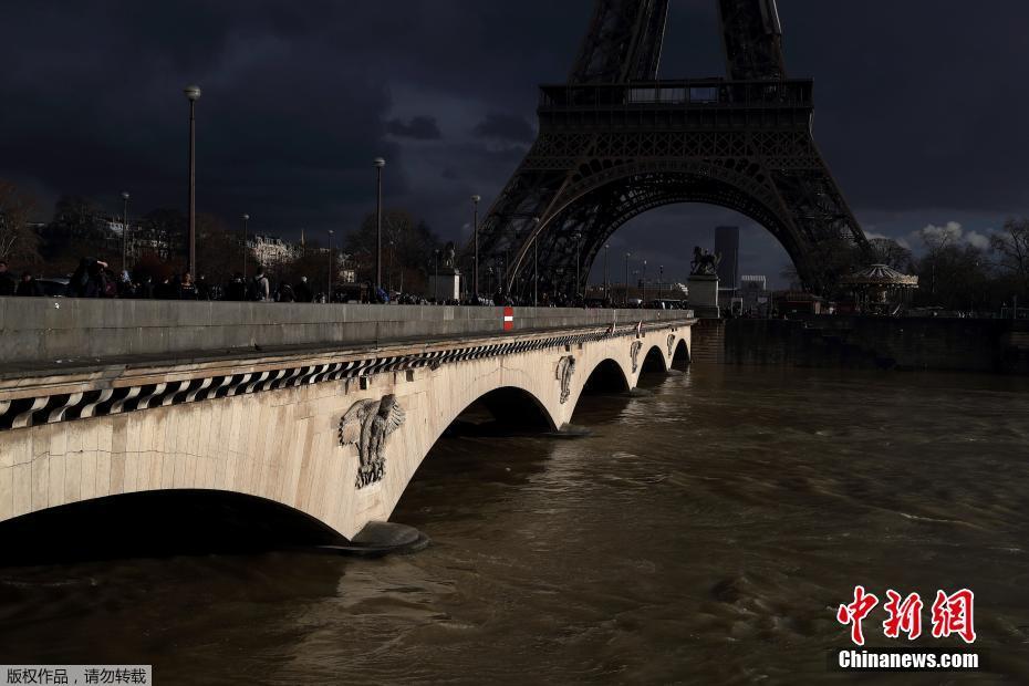 河水水位高涨,巴黎耶拿桥的桥洞几乎被河水填满。据法国主要河流汛情信息中心预测,塞纳河水位在28日至29日夜间达到5.85至5.95米的峰值,低于2016年6.1米的峰值。